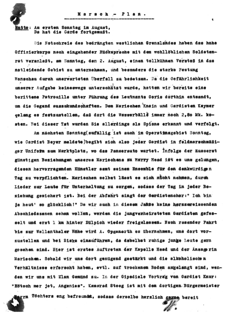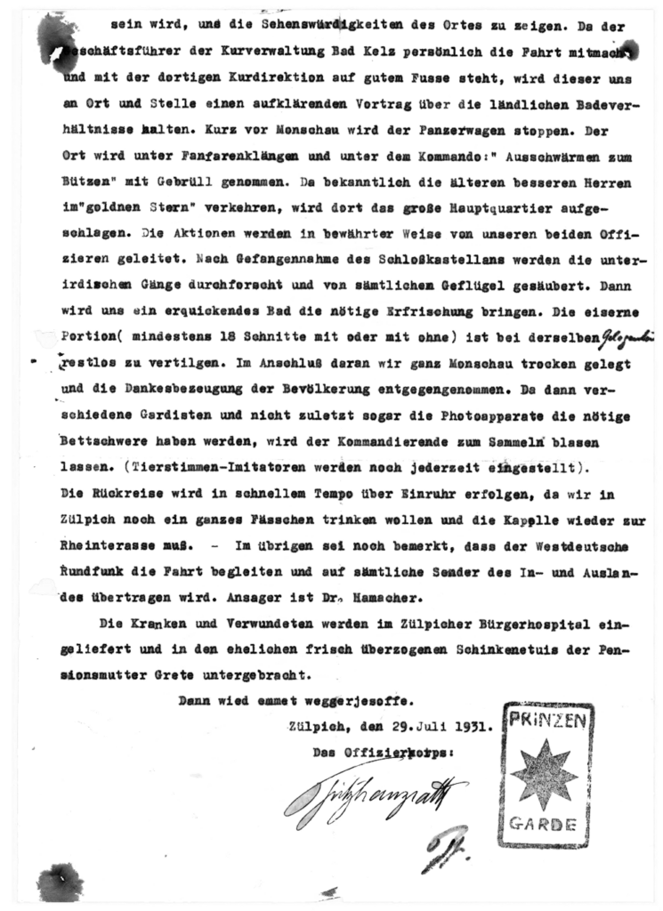 Bei der Sichtung und Sortierung der Archivalien in unserem Gardequartier Münstertor, fiel uns ein Schriftstück aus dem Jahre 1931 in die Hände. Bei diesem Schriftstück handelt es sich um die Einladung zu einem Ausflug der Prinzengarde nach Monschau.
