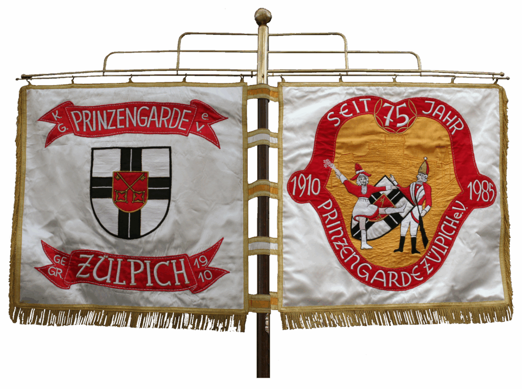 Anschließend hielt der Stadtdirektor a.D. und Ehrenoffizier der Prinzengarde Josef Trimborn die Laudatio zum 75-jährigen Jubiläum der Prinzengarde, in der er ihre Entstehung und Entwicklung darstellte und verdiente Mitglieder hervorhob. Unter spontanem Beifall rief er dazu auf, zum früheren urwüchsigen „Zölleche Fastelovend“ zurückzufinden und möglichst auf auswärtige, bezahlte „Profis“ zu verzichten. Im Laufe des Abends übergab er -gemeinsam mit dem Litewkaträger Josef Fischer- dem Präsidenten Hans Schall eine Standarte, für die sie bei den Ehrenoffizieren und Litewkaträger gesammelt hatten.